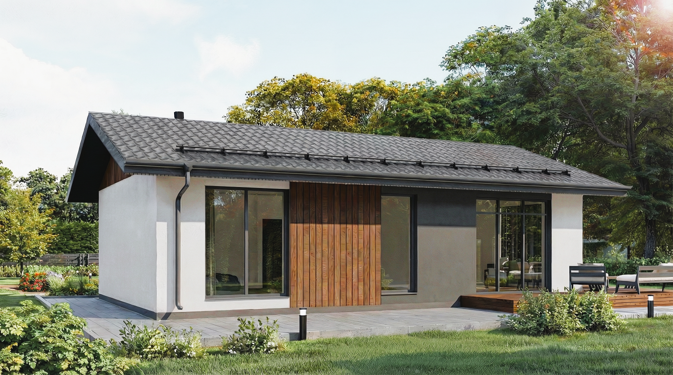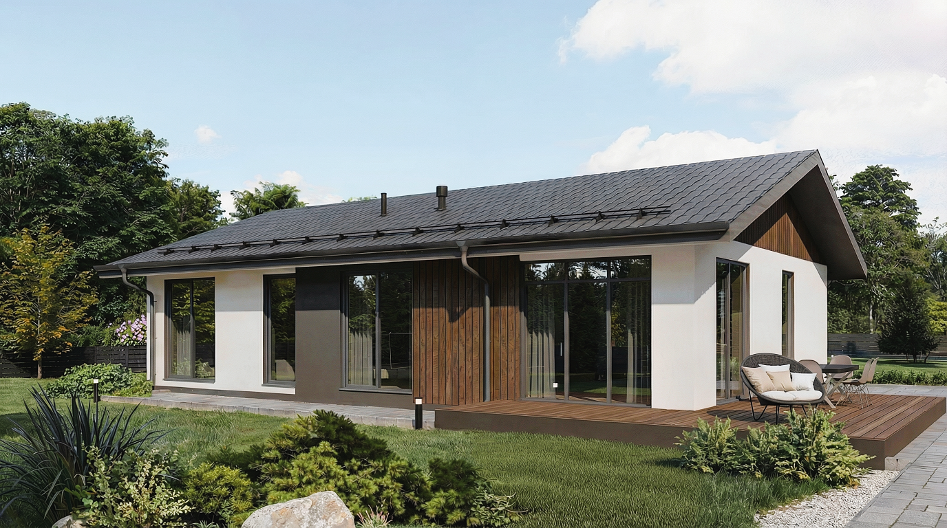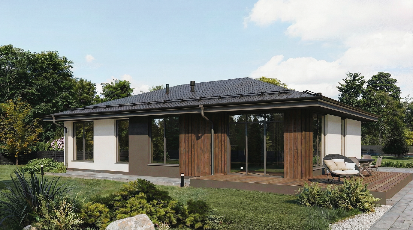 В центре дома — просторная кухня-гостиная с панорамными окнами и прямым выходом на террасу. Продуманная приватная зона: мастер-спальня с гардеробной и собственным санузлом. Две дополнительные спальни разделяют гостевую и детскую зоны. Отдельное техническое помещение для коммуникаций и хранения: всё необходимое под одной крышей.