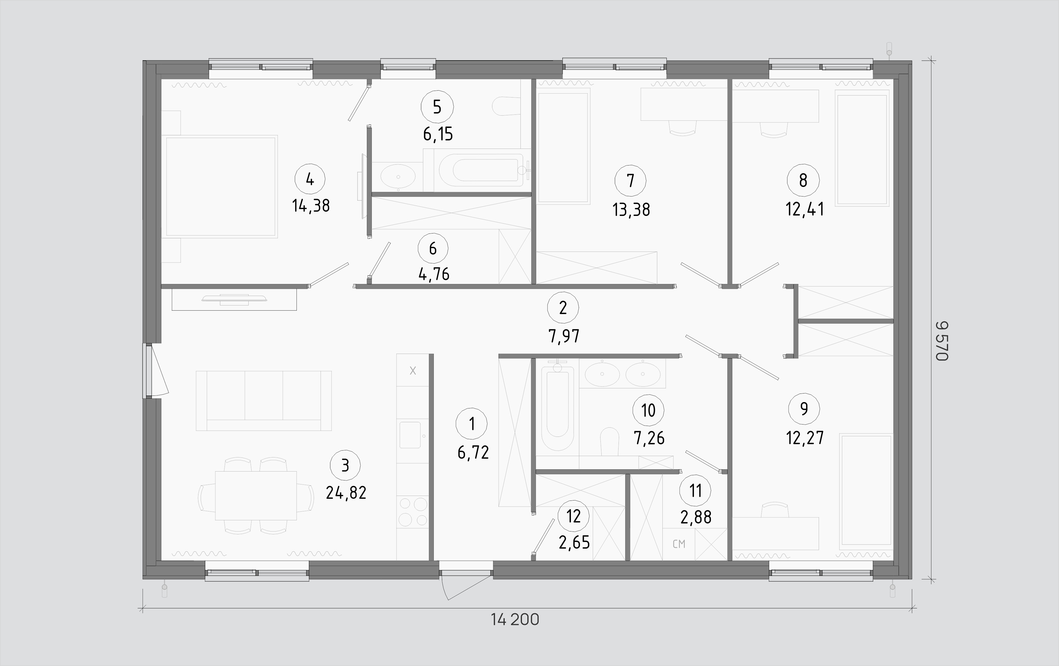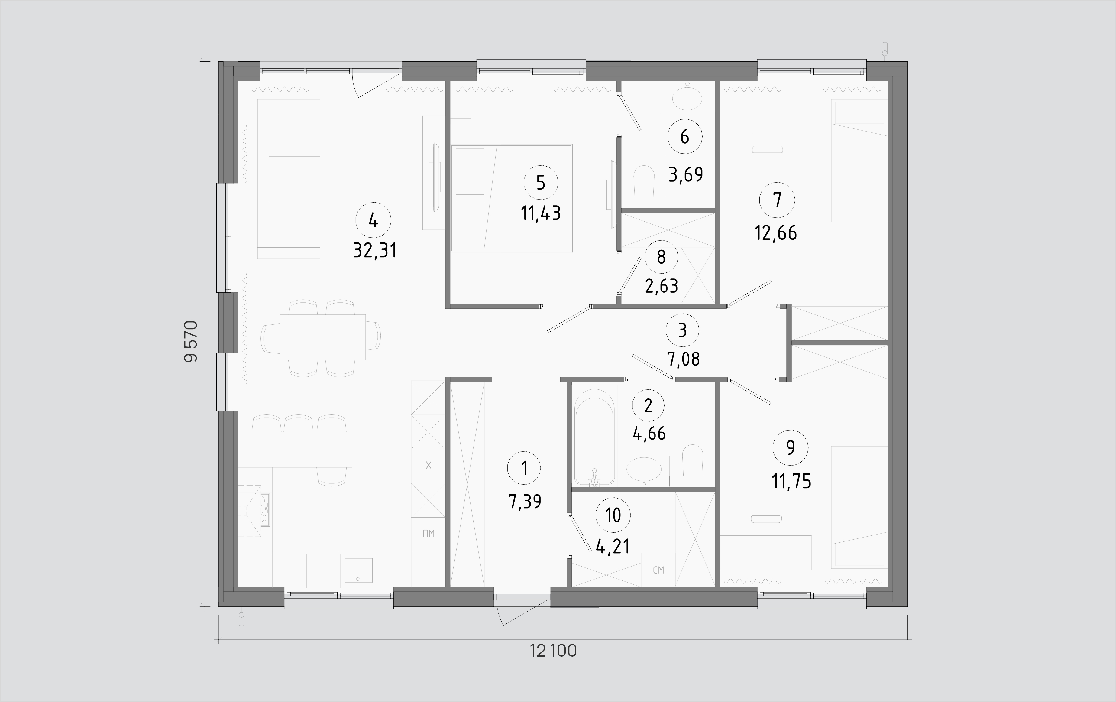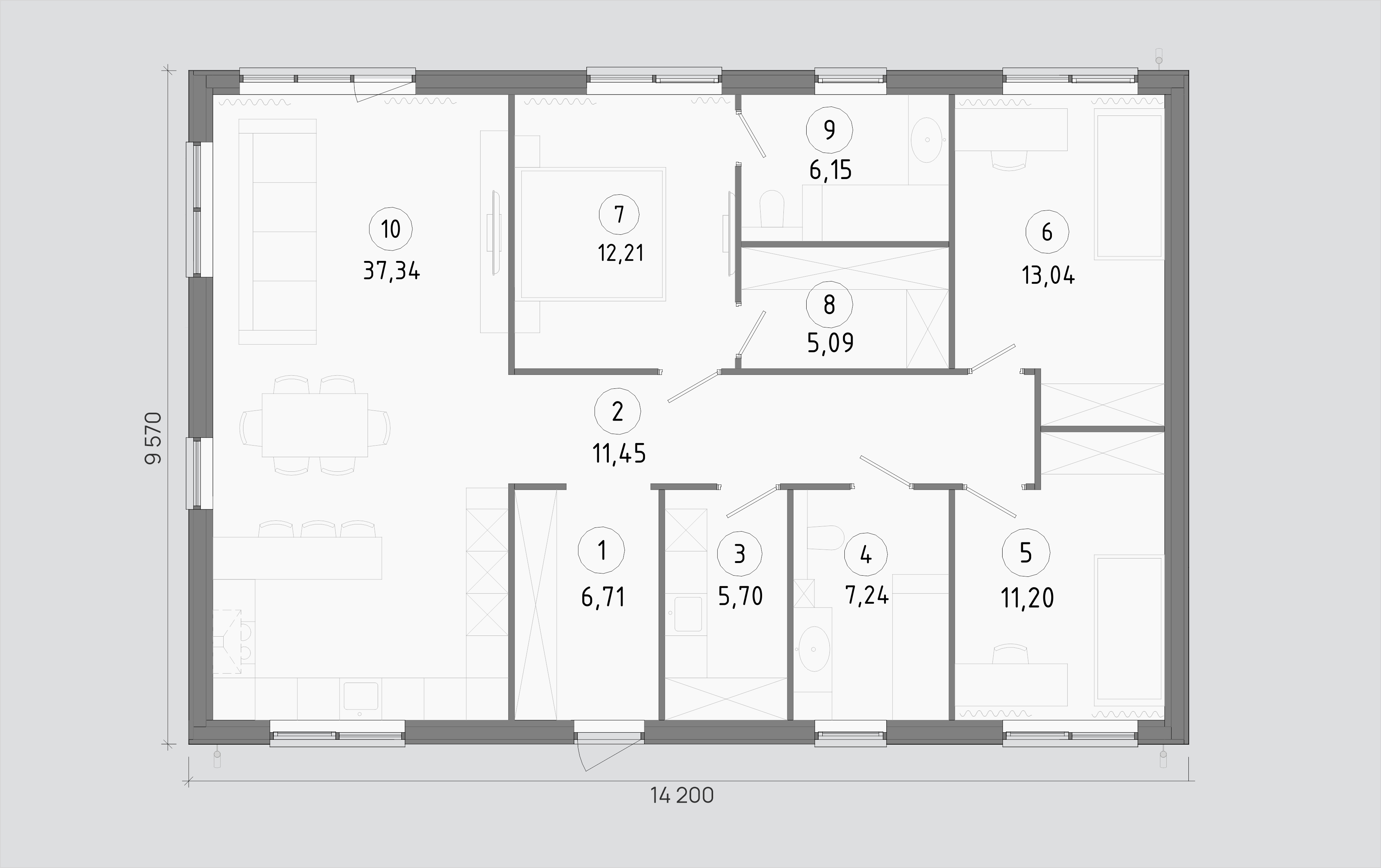 В центре дома — просторная кухня-гостиная с панорамными окнами и прямым выходом на террасу. Продуманная приватная зона: мастер-спальня с гардеробной и собственным санузлом. Две дополнительные спальни разделяют гостевую и детскую зоны. Отдельное техническое помещение для коммуникаций и хранения: всё необходимое под одной крышей.