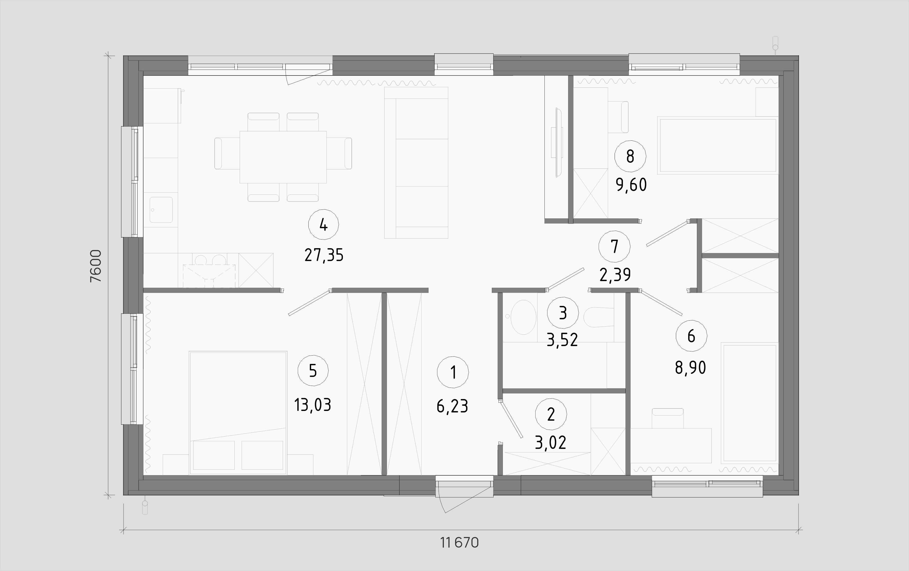 Компактный дом 75 м² создан прежде всего для семейной пары. В двухспальной версии предусмотрены просторная кухня-гостиная с выходом на террасу, мастер-спальня с собственным санузлом и гардеробной, а также гостевая спальня. При необходимости площадь можно переорганизовать под три спальни: две компактные детские и одну более просторную. В этом варианте кухня-гостиная остается достаточно большой, объединяя пространство для всей семьи.
