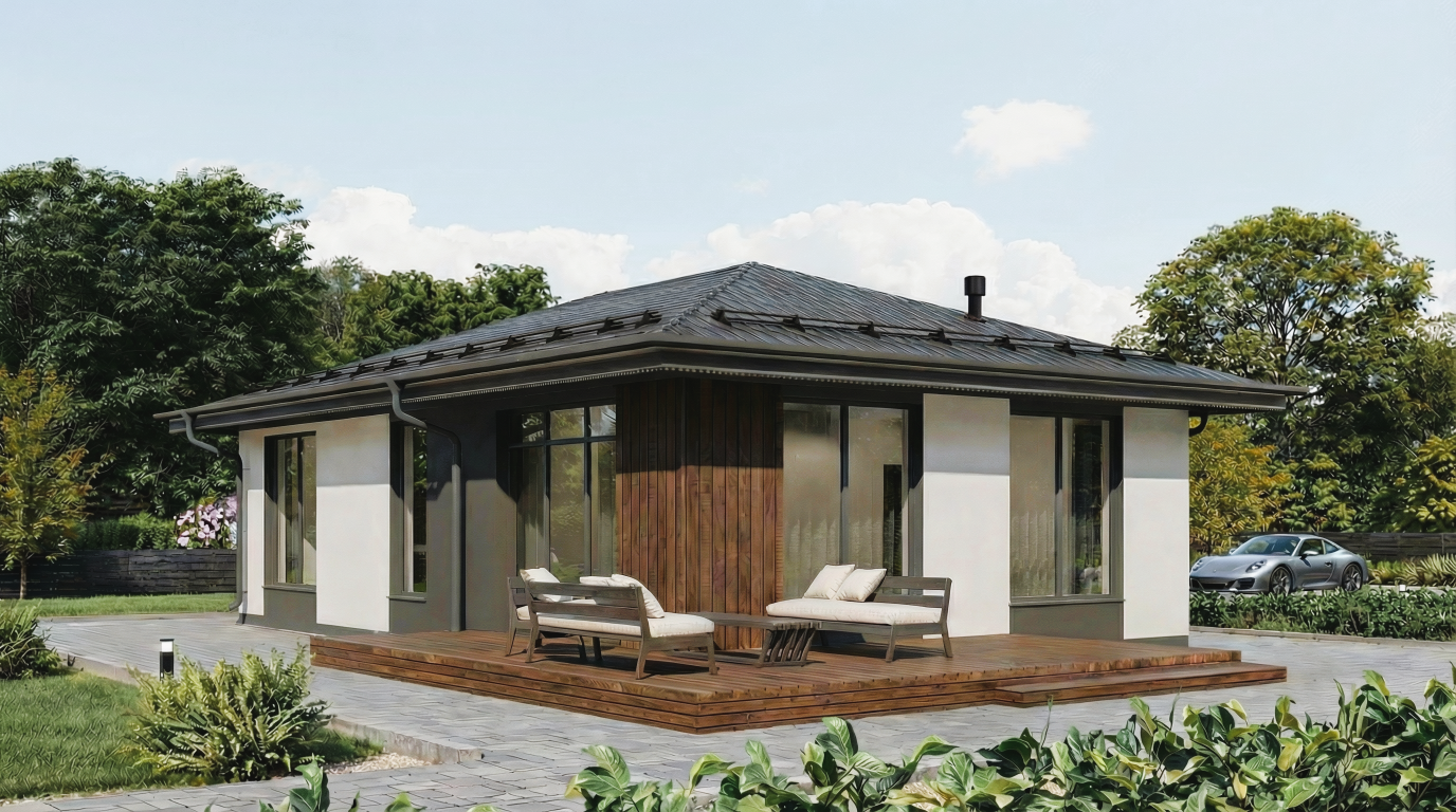 В основе модельного ряда — заводской домокомплект из трёхслойных армированных панелей с утеплением внутри. Архитектурная особенность серии: отсутствие несущих внутренних стен и возможность выбора между двух- и четырёхскатной кровлей. Это даёт полный простор для зонирования. Планировки, подготовленные при участии дизайнеров, ориентированы на эргономику: учтены реальные габариты мебели и даже расстояние, необходимое для штор.