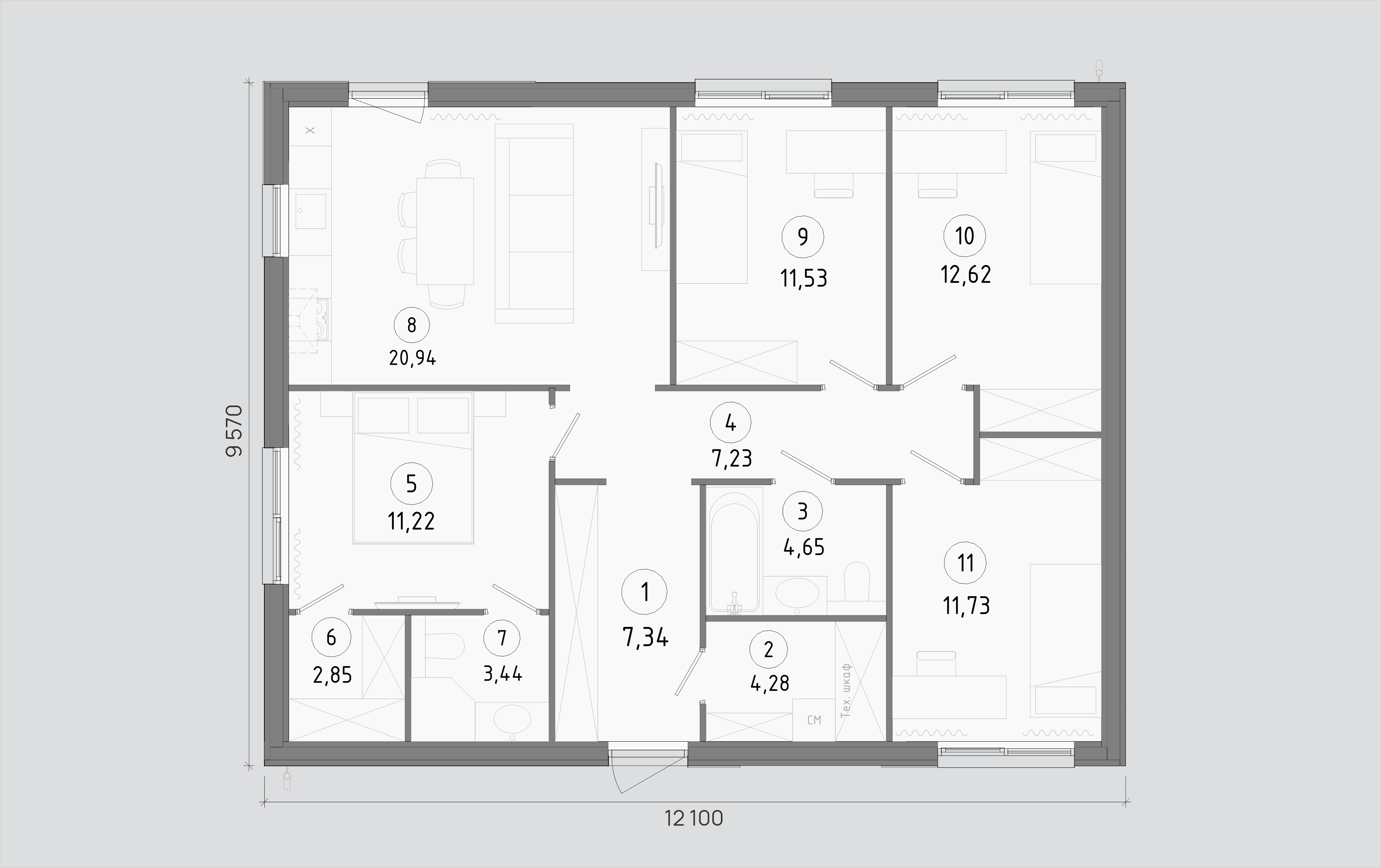 9,57 х 12,1 м