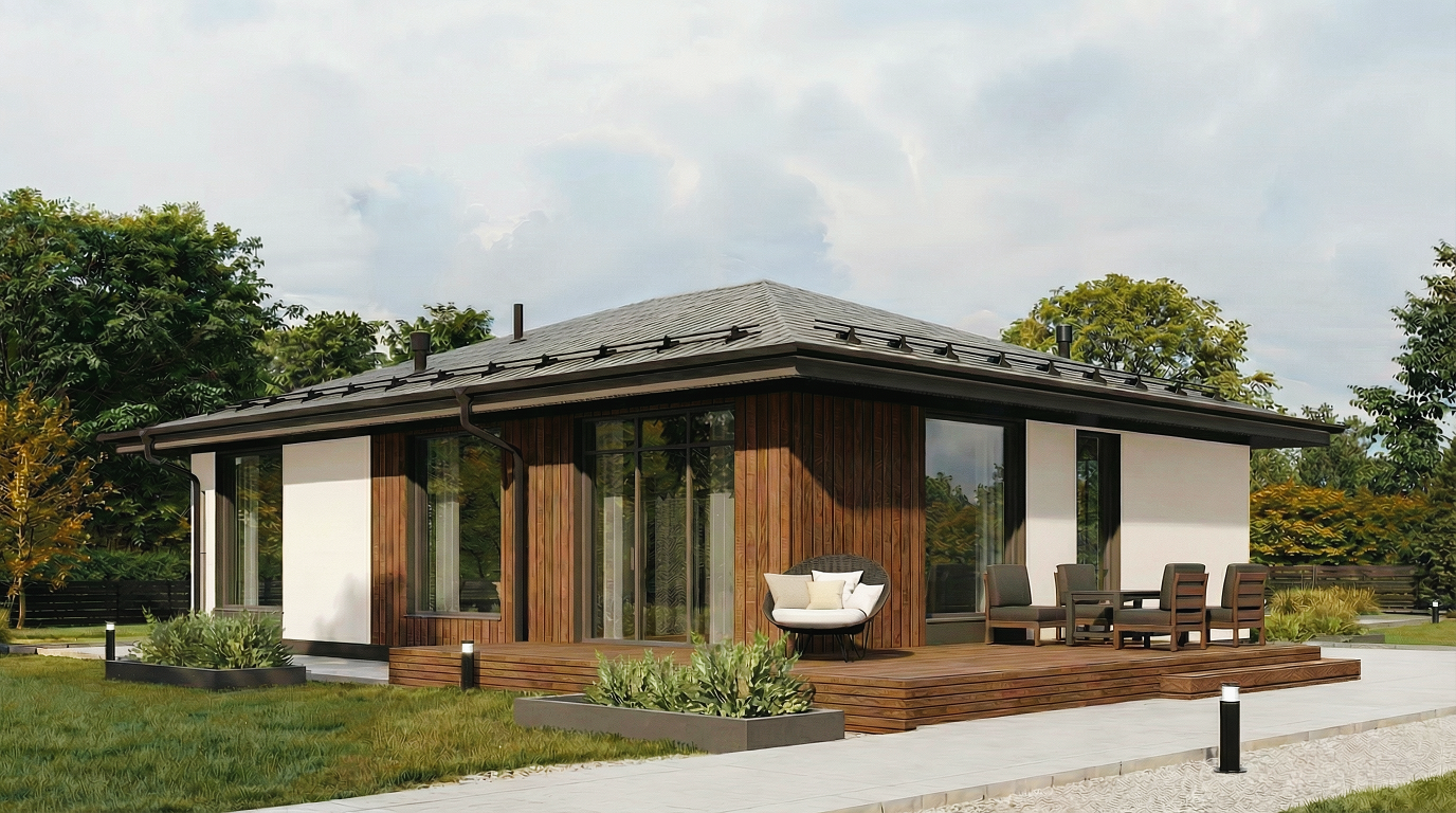 В планировке предусмотрен удобный гараж на 2 автомобиля с прямым входом в дом. Сердце дома — светлая кухня-гостиная с панорамным остеклением и выходом на уютную террасу. Изолированная мастер-спальня включает собственную гардеробную и санузел. Еще две отдельные спальни — для детей или гостей. Продуманная эргономика без лишних коридоров.
